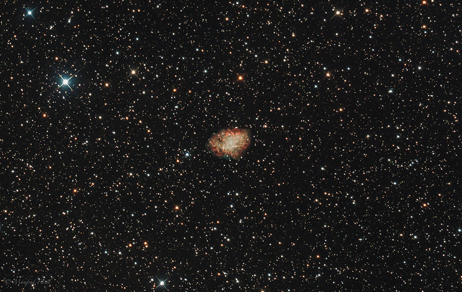 Der Krebsnebel oder auch Messier 1 ist der Überrest einer Supernova im Sternbild Stier. Im Jahr 1054 wurde diese Supernova zum ersten mal gesichtet. Damals war die Explosion als Stern am Tag neben der Sonne bemerkt worden.